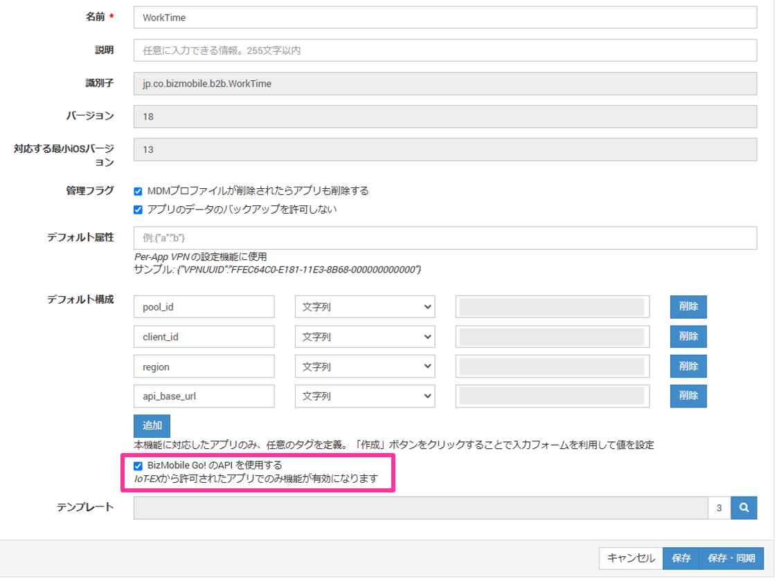 10. 「BizMobile Go!のAPI を使用する」にチェックを入れます。