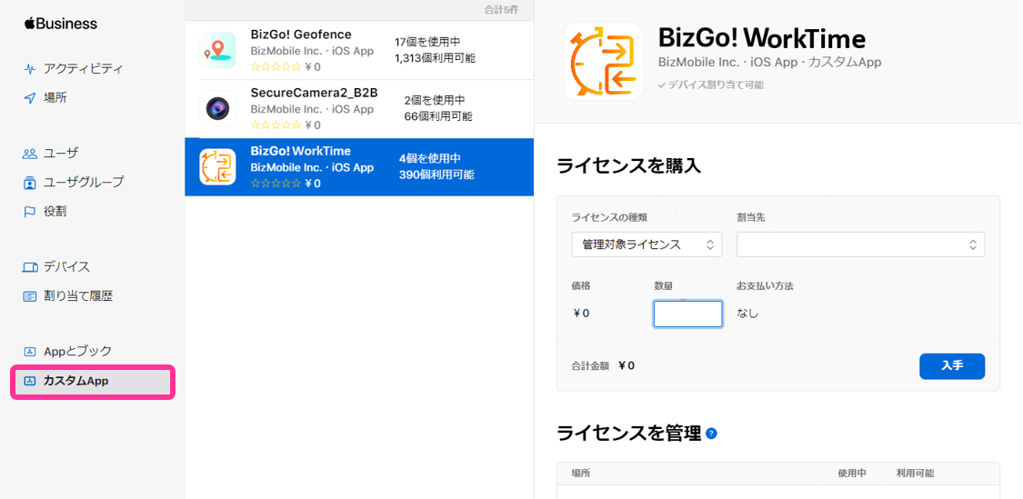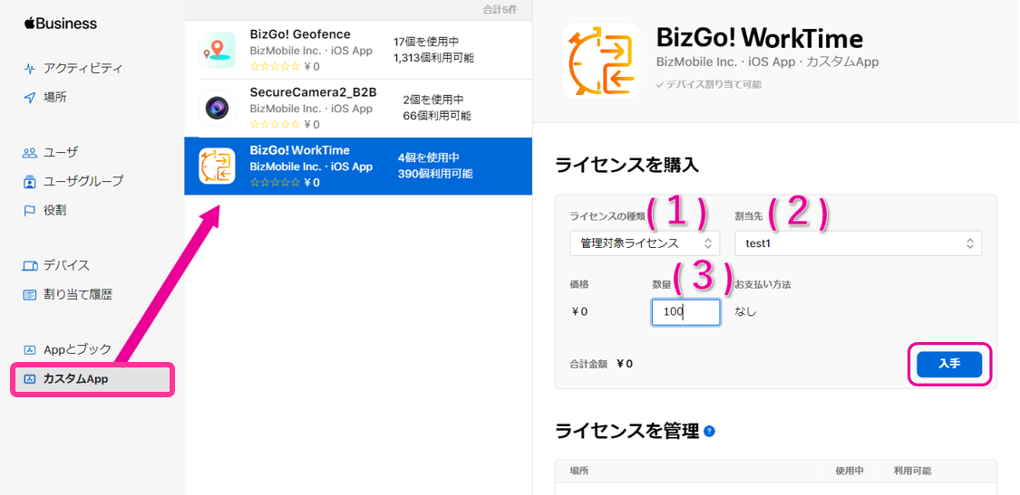 弊社側にてお客様情報の登録が完了しましたら、以下の手順にてアプリの購入、配付を実施ください。