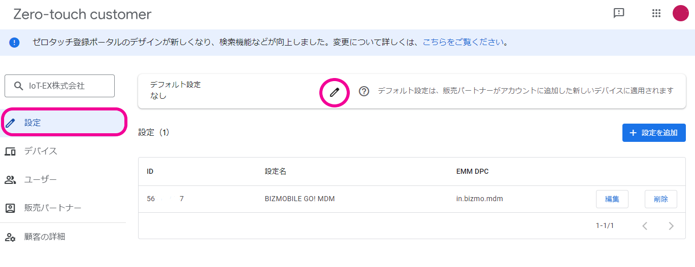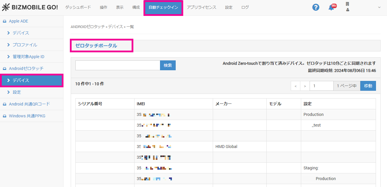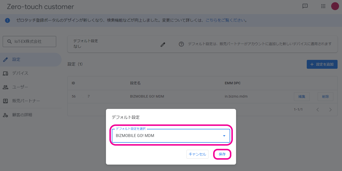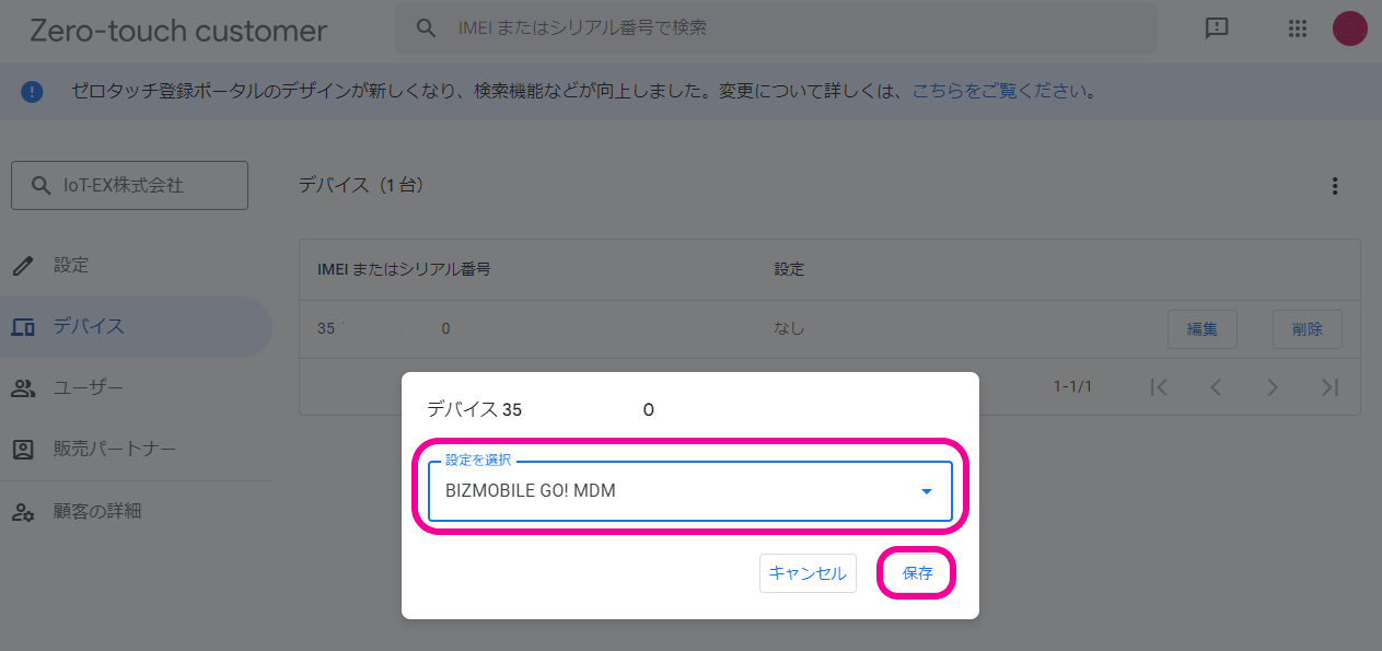 ゼロタッチポータルに登録されたデバイスをBizMobile Go!へ登録(チェックイン)できるようにするために、ゼロタッチポータルでBizMobile Go!へのデバイス割り当て作業を行います。