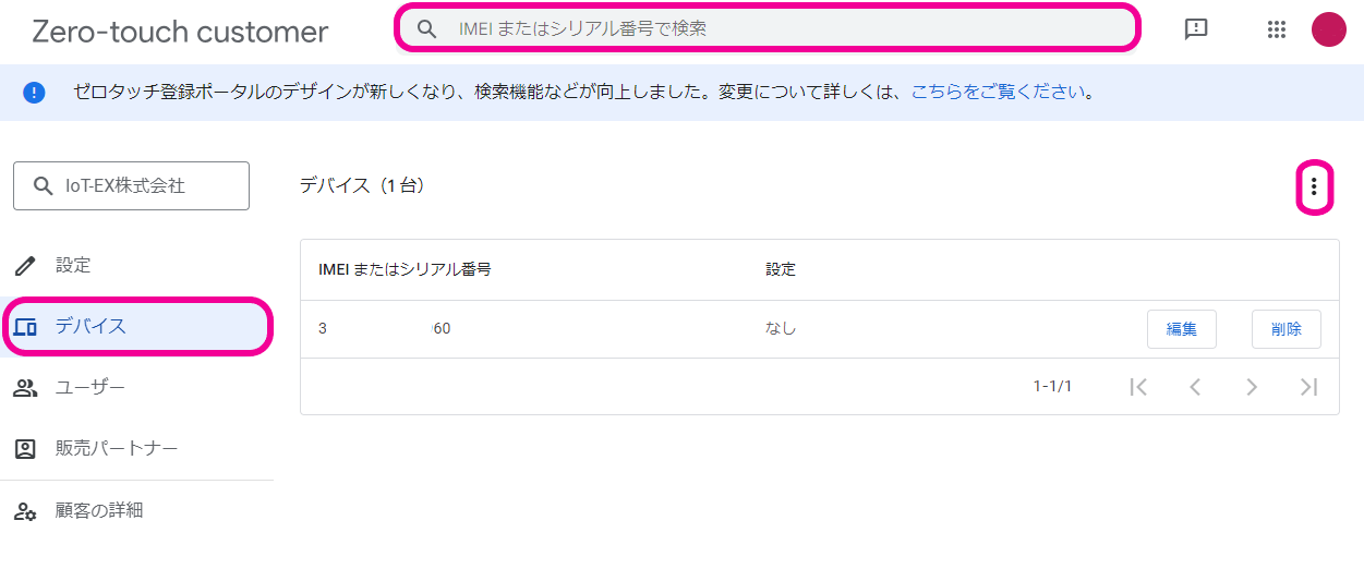 4.左メニューのデバイスをクリックし、シリアル番号、IMEIのいずれかを指定してBizMobile Go!へ割り当てるデバイスを検索します。